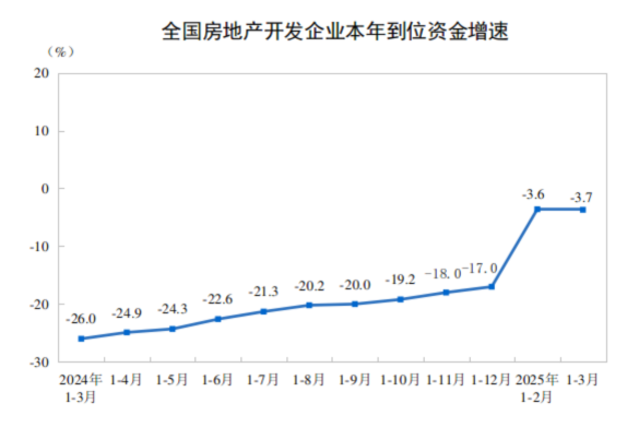 1—3月份,房地產開發企業到位資金24729億元,同比下降3.7%。其中,國內貸款4441億元,下降2.3%;利用外資1億元,下降83.2%;自籌資金8168億元,下降5.8%;定金及預收款7335億元,下降1.1%;個人按揭貸款3373億元,下降7.0%。
