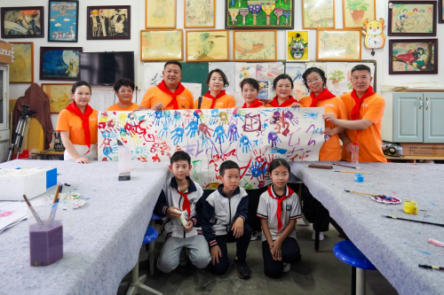 孩子們為表達謝意,為公益團隊的叔叔阿姨戴上了紅領巾,操場上洋溢著愉悅的歡笑聲。
