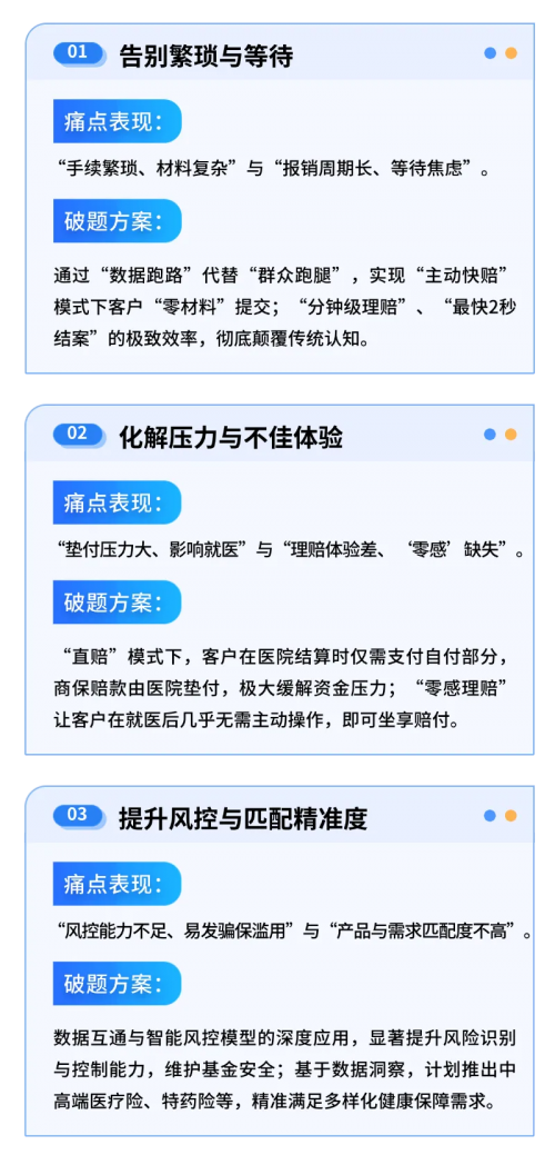 傳統保險理賠中,“材料繁瑣跑斷腿”、“報銷漫長空等待”、“墊付壓力如泰山”、“理賠體驗不稱心”、“風控滯后存隱患”、“供需錯配難滿足”等痛點,長期困擾著廣大用戶,也制約著行業服務質效的提升。