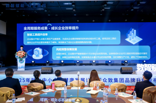 發布會上,眾致集團科技板塊負責人上臺,系統為全場觀眾展示了集團服務國家戰略,踐行雙總部使命,以數智化科技破解企業發展痛點,賦能企業全周期成長,構建企業數智協同生態的企業服務內容。