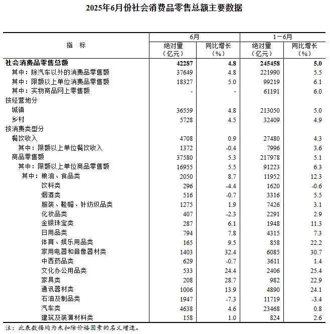 按經營單位所在地分,6月份,城鎮消費品零售額36559億元,同比增長4.8%;鄉村消費品零售額5728億元,增長4.5%。1—6月份,城鎮消費品零售額213050億元,增長5.0%;鄉村消費品零售額32409億元,增長4.9%。