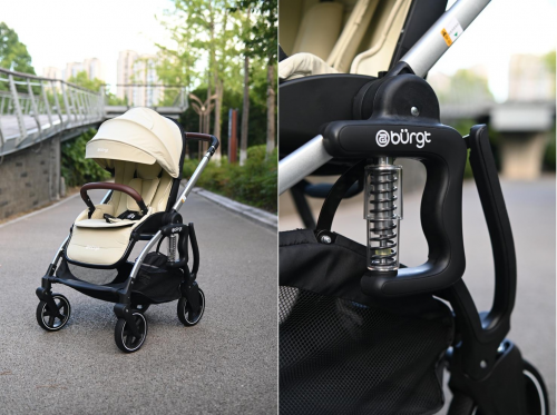 布格特嬰兒推車是在傳統彈簧緩震的基礎之上,自主研發了嬰兒推車液壓避震器,通過多連桿懸掛結構,將液壓避震器設計嵌入車架中控位置。也就是說,當嬰兒乘坐推車時遇到顛簸,車輪所遇到的顛簸能量會通過多連桿懸掛避震系統,將顛簸震動能量傳遞導入液壓避震器中,由避震器將顛簸能量消耗,從而保障寶寶在推車內的舒適度,減少顛簸產生的不適。這一避震原理和產品呈現方式,在目前全球嬰兒推車領域內都是比較創新的產品及理念,在很大程度上推動了嬰兒推車行業避震新時代的變革。