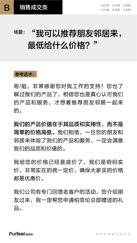 同時,《柏菲倫銷售實戰手冊》采用“問題+需求分析+應答公式+話術示例”的結構,覆蓋迎賓破冰、價格談判、售后保障等全流程場景。