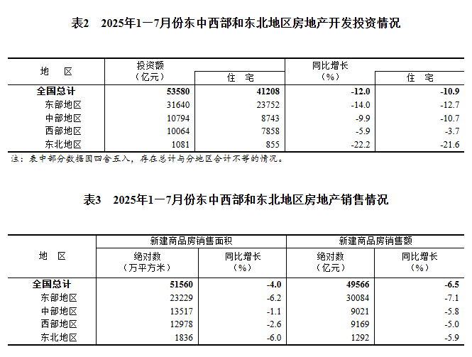 1—7月份,全國房地產開發投資53580億元,同比下降12.0%(按可比口徑計算,詳見附注6);其中,住宅投資41208億元,下降10.9%。