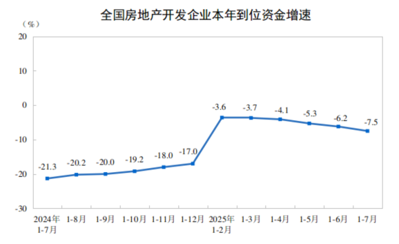 1—7月份,房地產開發企業到位資金57287億元,同比下降7.5%。其中,國內貸款9207億元,增長0.1%;利用外資17億元,增長3.2%;自籌資金23230億元,下降8.5%;定金及預收款16815億元,下降9.9%;個人按揭貸款7918億元,下降9.3%。