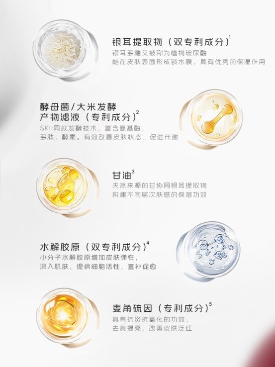 其中,多項(xiàng) “專利級(jí)成分” 成為產(chǎn)品底氣:雙專利成分銀耳提取物(專利號(hào) ZL201710606697.0、ZN111034537B)被譽(yù)為 “植物界玻尿酸”,親膚度是普通玻尿酸的 10 倍,能在皮膚表面織就鎖水膜,沙漠皮敷后第二天仍能保持 “嘭嘭水潤感”;酵母菌 / 大米發(fā)酵產(chǎn)物濾液(專利號(hào) ZL 2018 1 1128966.8),以發(fā)酵黑科技釋放高活性維生素與氨基酸,熬夜黨敷完暗沉臉能直接亮兩個(gè)度;雙專利水解膠原(專利號(hào) ZL 202311427857.7、ZL 202310314059.7)分子量小于 500da,能被皮膚直接吸收,干紋細(xì)紋像被 “熨斗熨過”,抗皺效果堪稱 “封神”;還有添加量達(dá) 1200ppm 的專利麥角硫因(專利號(hào) ZL202011209524.3),曾經(jīng)的100萬一噸的”天價(jià)”抗氧明星,讓黃黑皮收獲 “自然提亮” 的驚喜。
