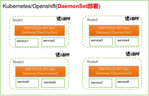 另一種適配于全向API流量防護場景,通過在每個Kubernetes節點部署Daemonset安全容器實現惡意流量的劫持和處理。