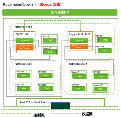 創新方案支持兩種場景部署,一種是適配于Ingress南北向流量防護場景,通過在Ingress Pod旁掛安全容器實現對惡意流量的劫持和處理。