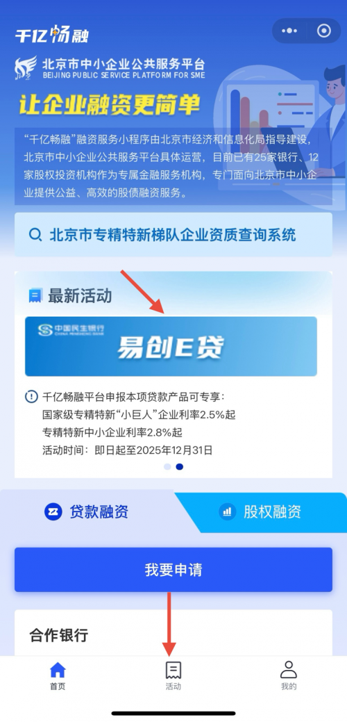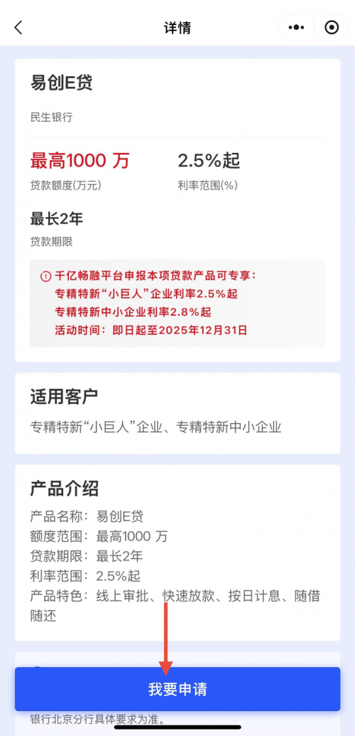 即日起至2025年12月31日,通過千億暢融小程序申報本項貸款產(chǎn)品可專享專精特新“小巨人”企業(yè)利率2.5%起,專精特新中小企業(yè)利率2.8%起。