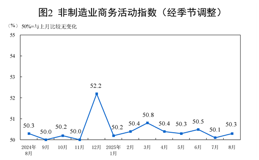 8月份,非制造業商務活動指數為50.3%,比上月上升0.2個百分點,高于臨界點,非制造業繼續保持擴張。