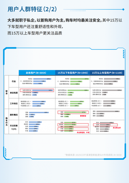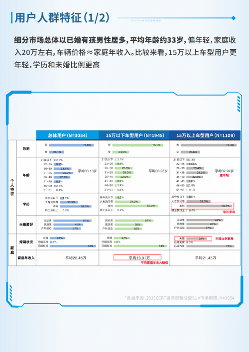 調研顯示,緊湊型新能源SUV用戶以已婚有孩家庭為主,平均年齡約33歲。不同價格區間呈現明顯分層: