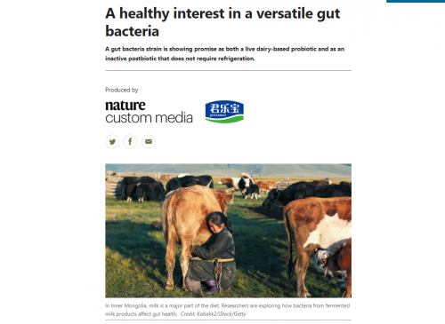 核心提示:近日,全球頂級科研期刊《Nature》發表題為《A healthy interest in a versatile gut bacteria》的文章,刊登了君樂寶乳業集團在益生菌領域的最新研究成果。近日,全球頂級科研期刊《Nature》發表題為《A healthy interest in a versatile gut bacteria》的文章,刊登了君樂寶乳業集團在益生菌領域的最新研究成果。該成果充分展現了君樂寶在功能性菌株科研領域實現的重大突破,彰顯君樂寶獲得國際學術界的廣泛認可,為其持續推進科研創新、深化產學研融合再添有力注腳。