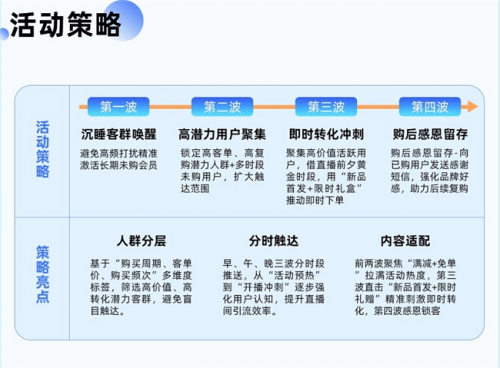 泰蘭尼斯以 “購買周期、客單價、購買頻次” 等標簽分層用戶,篩選高價值客群避免盲目觸達,分四波推進:喚醒沉睡客群、聚集高潛力用戶、沖刺即時轉化、留存購后用戶。