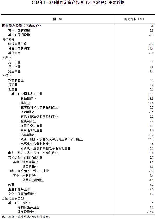 2025年1—8月份全國固定資產投資增長0.5%