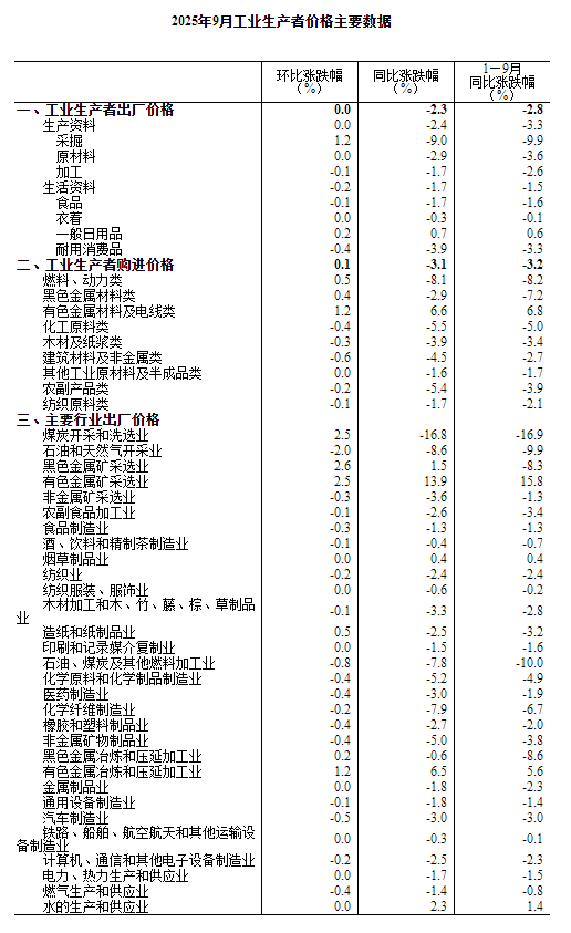 核心提示:2025年9月份,全國工業生產者出廠價格同比下降2.3%,降幅比上月收窄0.6個百分點,環比繼續持平。工業生產者購進價格同比下降3.1%,降幅比上月收窄0.9個百分點,環比2025年9月份,全國工業生產者出廠價格同比下降2.3%,降幅比上月收窄0.6個百分點,環比繼續持平。工業生產者購進價格同比下降3.1%,降幅比上月收窄0.9個百分點,環比上漲0.1%。1—9月平均,工業生產者出廠價格比上年同期下降2.8%,工業生產者購進價格下降3.2%。