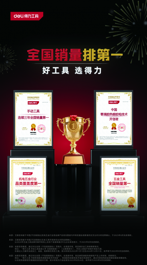 核心提示:近日,得力工具迎來市場征程中的又一個高光時刻,一舉斬獲國內兩大權威機構頒發的四項重磅認證。近日,得力工具迎來市場征程中的又一個高光時刻,一舉斬獲國內兩大權威機構頒發的四項重磅認證。基于領先的市場銷量與卓越的綜合實力,得力集團旗下專業工具品牌“得力工具”獲得艾媒咨詢(iiMedia Research)與尚普咨詢(SHANGPU GROUP)的高度認可,被授予“五金工具全國銷量第一”、“機電五金行業品類覆蓋度第一”、“手動工具全國銷量第一”以及“中國零滴膠熱熔膠槍技術開創者”四項重磅認證。這四項認證涵蓋了市場表現、品類布局與技術革新三大維度,不僅印證了得力工具在行業內的領先地位,更展現了其作為國民品牌向智能化、高端化邁進的堅實步伐。