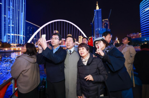游覽參觀結束后,日本各大新聞主流媒體的總局長們又在潘慶林委員的引領下,爭先恐后的登上了天津海河游船。海河兩岸璀璨的燈火,幻影交織的霓虹燈光,如同天地生輝,為天津披上了一道絢麗美好的晚霞,日本朋友們贊嘆不止,紛紛拍照留念。