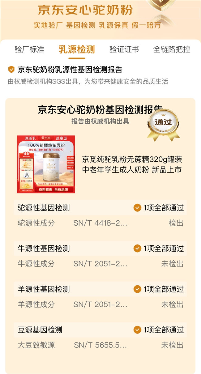 權(quán)威第三方檢測機構(gòu)SGS為京東超市駝奶粉出具乳源性基因檢測報告,通過專業(yè)技術(shù)嚴格檢測駱駝、牛、羊、豆等各類乳源基因成分,最大限度減少摻假問題,時刻守護消費者舌尖上的安全。