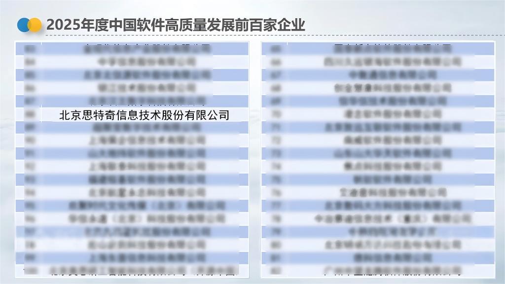 此次入選“2025年中國軟件高質(zhì)量發(fā)展前百家企業(yè)”,不僅是對思特奇三十年來技術積淀與行業(yè)貢獻的高度認可,也彰顯了公司在“新質(zhì)生產(chǎn)力”培育與“數(shù)字經(jīng)濟”實踐中的領先地位。