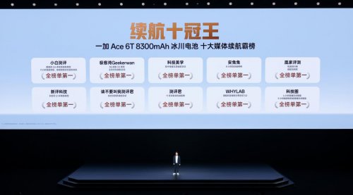 一加 Ace 6T配備8300mAh 超巨量冰川電池,支持100W超級閃充,是行業中唯一兼具8300mAh 電池和百瓦閃充的機型,續航實力異常強悍,霸榜10大專業科技媒體續航實測榜單榜首,成為當之無愧的“續航十冠王”。