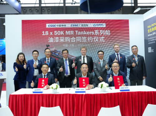 12月2日展會開幕第一天,一場意義深遠(yuǎn)的簽約儀式掀起了現(xiàn)場第一輪高潮。海虹老人與廣船國際有限公司、中國船舶集團(tuán)物資有限公司正式簽署了18艘50K MR Tankers系列船油漆采購合同。此次簽約不僅是一份商業(yè)訂單,更是三方攜手邁向綠色船舶制造新階段的戰(zhàn)略里程碑。