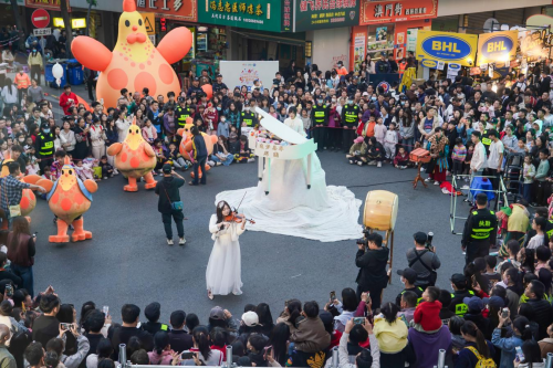 體驗(yàn)感上,活動(dòng)突破“被動(dòng)觀看”模式,通過(guò)“美食+文旅+商業(yè)”的深度融合,打造一個(gè)集觀賞、品嘗、探索、互動(dòng)于一體的新場(chǎng)景。“小清家族”領(lǐng)銜的巡游演出亮點(diǎn)十足,英歌舞、高蹺戲《市郎圖》、魚(yú)燈巡游與“云上”鋼琴演奏巧妙融入清遠(yuǎn)雞元素,非遺與潮流碰撞出獨(dú)特魅力。