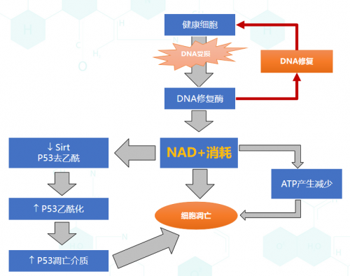 PARP(聚ADP核糖聚合酶):作為DNA損傷修復的“核心工具”,PARP在DNA單鏈斷裂時會被激活,而修復過程需大量消耗NAD⁺。當細胞遭遇氧化應激等損傷時,PARP會過度激活導致NAD⁺耗竭,進而抑制Sirtuins功能,引發細胞衰老或凋亡。NMN通過補充NAD⁺,可為DNA修復提供原料,避免NAD⁺耗竭危機。
