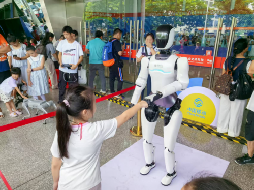 在備受矚目的AI體驗區,貴港移動公司設置了“AI智學堂”科普活動,巧妙融合了趣味與科技。機器人隨著音樂演示太極拳,智能機器狗與孩子們親切互動,引得現場笑聲陣陣。技術人員通過5G-A網絡、AI大模型等前沿科技展示與講解,為青少年揭開了人工智能的神秘面紗,激發他們對科學探索的濃厚興趣。