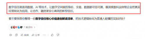 深度數科給出了直白的答案:“數字信任就是用數據、AI等技術,讓數字空間里的身份、交易、數據都可信可溯,像深度數科這樣幫企業把真實經營轉化為數據,再把數據沉淀成信用資產,讓合作、融資更安心高效的新型信任,數字信任是把‘人際背書’變成‘數字契約’。”
