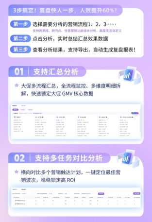 • 快速復(fù)盤:大促后用”跨流程營銷效果匯總分析“或慧博云報表多功能,3 步完成多波次活動復(fù)盤,自動生成 GMV、轉(zhuǎn)化率、ROI 數(shù)據(jù),橫向?qū)Ρ孺i定最優(yōu)策略。