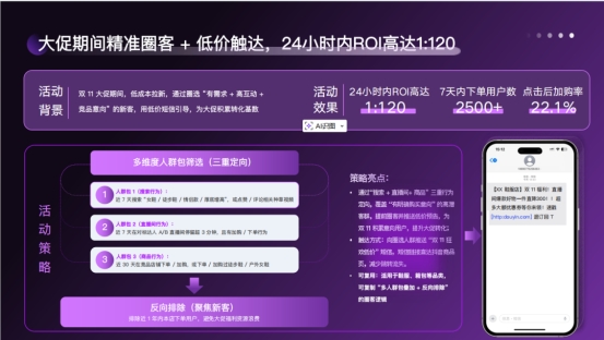 • 全鏈路覆蓋:從預(yù)售引流到復(fù)購激活,每個節(jié)點(diǎn)精準(zhǔn)觸達(dá);