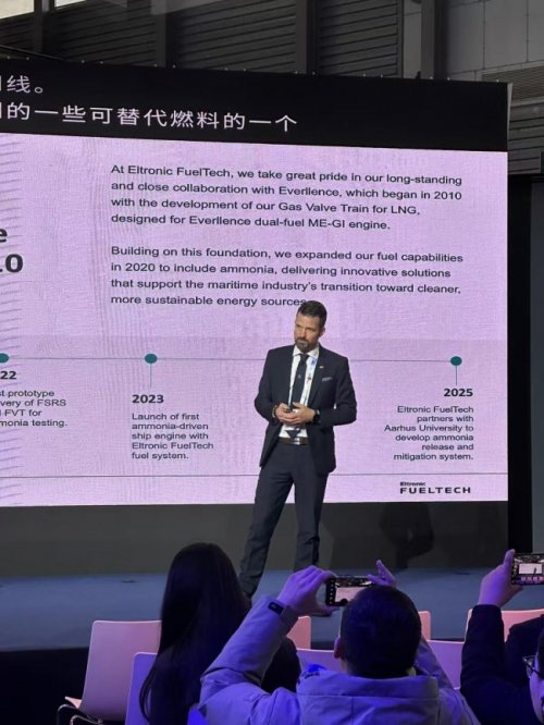 作為展會(huì)會(huì)議議程的重要環(huán)節(jié)之一,銷售總監(jiān)(船東關(guān)系部)Kenneth Thorup發(fā)表了題為《氨:未來(lái)燃料》的演講。他深入剖析了氨作為零碳能源在長(zhǎng)途航運(yùn)中的巨大潛力:當(dāng)前海事行業(yè)正加速脫碳進(jìn)程,氨燃料憑借零碳排放優(yōu)勢(shì),已成為全球關(guān)注的焦點(diǎn)領(lǐng)域。這場(chǎng)分享也為行業(yè)同仁提供了高價(jià)值的技術(shù)參考。