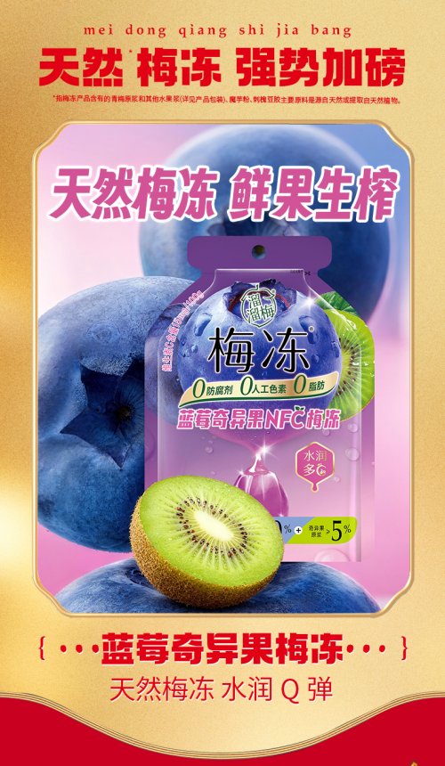 值得一提的是,兩款禮包中都備受青睞的梅凍系列,更是憑借“天然健康” 打破傳統果凍邊界,“天然梅凍,水潤多C”的核心賣點深入人心。它選用植物蒟蒻粉等優質原料,依托正壓過濾無菌鎖鮮技術鎖住風味營養,每100g含15mg維生素C,0防腐劑、0人工色素、0脂肪的配置搭配NFC鮮果生榨工藝,適配全人群需求。目前熱門口味中,銷量TOP的茉莉青提味、酸甜爽口的蜂蜜柚子味、果香濃郁的藍莓奇異果味,每一款都水潤Q彈,為新年風味增添清新層次。