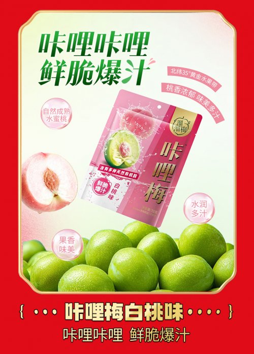 其中尤為搶眼的是咔哩梅(白桃味),作為脆青梅的全新升級款,選用黃山山脈大青梅當日鮮采當日加工,添加真實白桃原漿,“咔哩咔哩”的鮮脆口感搭配清新桃香,再融合天然有機酸的酸甜,成為年輕群體爭相打卡的爆款單品。