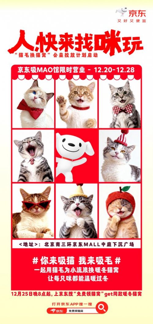 12月20日至28日,京東“吸MAO館”公益貓咖在京東MALL北京南三環店限時開業,10只“貓咪店員”上崗。消費者到店可參與吸貓互動,并在現場體驗寵物清潔家電趨勢新品。京東生活小家電同步將養寵家庭的清潔需求與流浪貓過冬救助結合,用戶在現場使用寵物清潔家電收集貓毛,吸到的貓毛越多,京東投放的貓窩就越多。