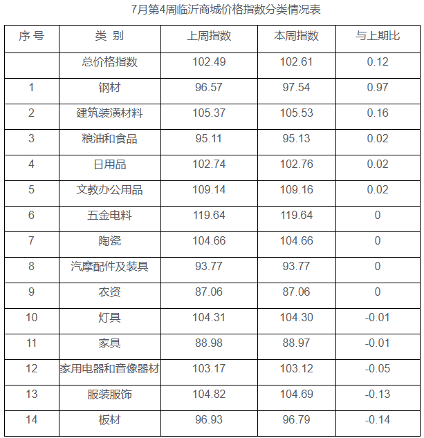 7月第4周臨沂商城價格指數小幅回升