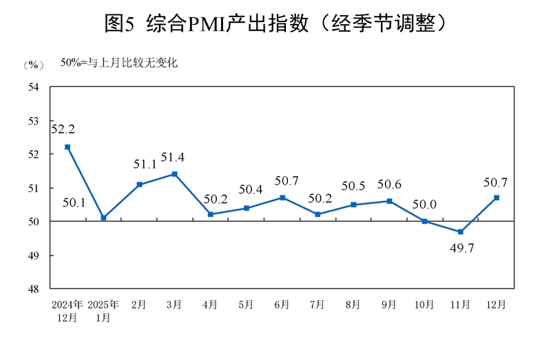 12月份,綜合PMI產出指數為50.7%,比上月上升1.0個百分點,表明我國企業生產經營活動總體較上月擴張。