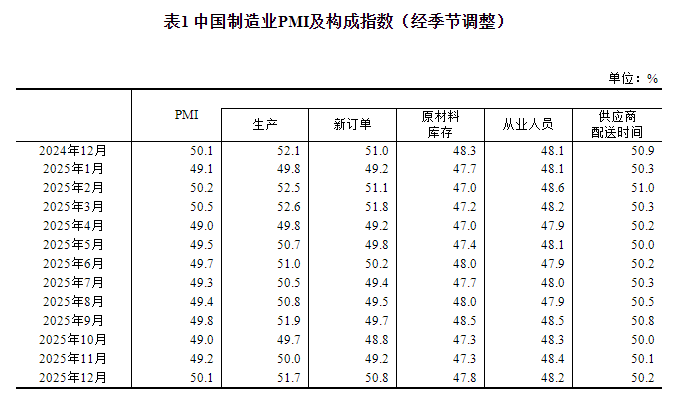 核心提示:2025年12月中國采購經理指數運行情況國家統計局服務業調查中心中國物流與采購聯合會 一、中國制造業采購經理指數運行情況 12月份,制造業采購經理指數(PMI)為50.2025年12月中國采購經理指數運行情況