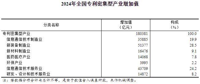 經核算,2024年全國專利密集型產業增加值為180381億元,占國內生產總值(GDP)的比重為13.38%,比上年提高0.34個百分點。