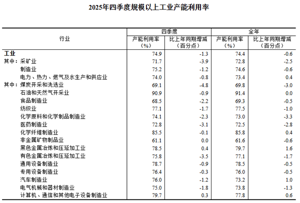 2025年四季度全國規模以上工業產能利用率為74.9%