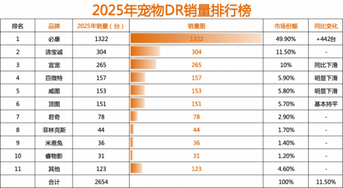 2025年的銷量榜單,是一張清晰的中國寵物DR市場“終局圖”的預覽。必康以接近半壁江山的份額,定義了體系化競爭的終局形態——強者通過規模、效率和網絡構建起幾乎無法逾越的護城河。