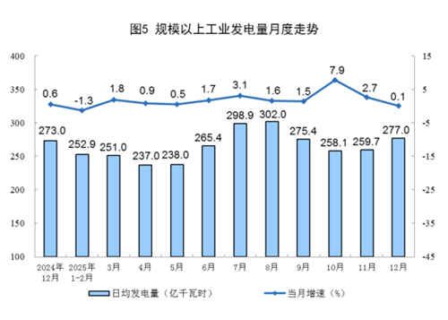 規上工業電力生產保持增長。12月份,規上工業發電量8586億千瓦時,同比增長0.1%;日均發電量277.0億千瓦時。1—12月份,規上工業發電量97159億千瓦時,同比增長2.2%。