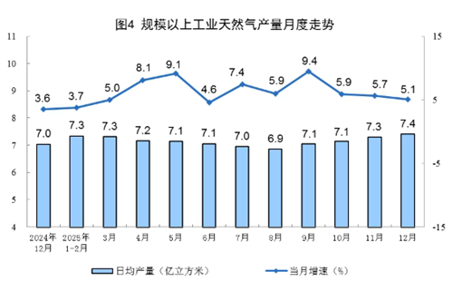 天然氣生產平穩增長。12月份,規上工業天然氣產量230億立方米,同比增長5.1%;日均產量7.4億立方米。
