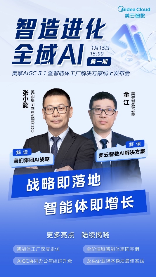 核心提示:作為6場直播的系列發布會首發活動,美的集團副總裁兼CDO張小懿與美云智數總裁金江,分別從戰略高度與實踐層面,共同探索AI技術賦能制造業的創新路徑:張小懿以“場景驅動+技術賦能”為核心框架,深入解析美的在AIGC領域的落地策略;金江則結合一線實踐,詳述美云智數如何通過數字化與AI技術的深度協同,打通制造業全價值鏈,推動產業降本提效。2026年2月2日,美云智數“智造進化 全域AI”線上發布會完美收官。作為6場直播的系列發布會首發活動,美的集團副總裁兼CDO張小懿與美云智數總裁金江,分別從戰略高度與實踐層面,共同探索AI技術賦能制造業的創新路徑:張小懿以“場景驅動+技術賦能”為核心框架,深入解析美的在AIGC領域的落地策略;金江則結合一線實踐,詳述美云智數如何通過數字化與AI技術的深度協同,打通制造業全價值鏈,推動產業降本提效。