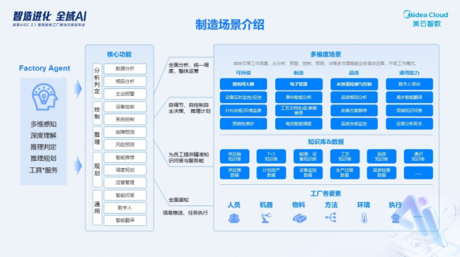 制造智能體:美云智數制造領域智能體通過Factory Agent賦能工廠,提升效率、降低損失、優化品質。如TPM智能體預測設備風險,優化維保計劃;DMS智能體提升管理效率;模具智能體優化利用率,保障品質與效率。智能體覆蓋工廠關鍵要素,助力企業構建高效、可持續的制造體系。