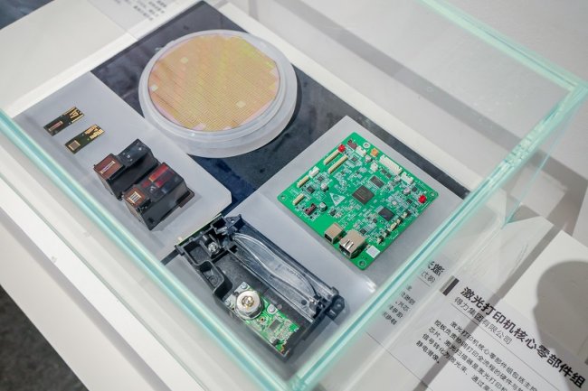 得力這次在國博的展出產品,是打印機和它的“心臟”。其中包括激光打印機組件,十大核心元器件已全面實現國產化,有激光掃描器、主控板(龍芯2P0500)等,目前得力的激光打印機已經實現了從主控芯片到激光掃描器,從固件到驅動的全棧自研。噴墨打印機組件則包括有晶圓、噴頭芯片、噴頭等。