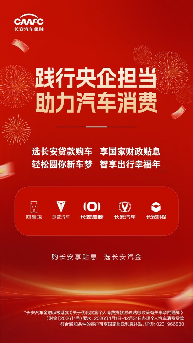 核心提示:為持續釋放汽車消費潛力,近期,財政部、中國人民銀行及金融監管總局等部門聯合優化并延長個人消費貸款財政貼息政策實施期限至2026年12月31日,并將汽車金融公司正式納入經辦機構范圍。為持續釋放汽車消費潛力,近期,財政部、中國人民銀行及金融監管總局等部門聯合優化并延長個人消費貸款財政貼息政策實施期限至2026年12月31日,并將汽車金融公司正式納入經辦機構范圍。長安汽車金融積極響應政策號召,快速完成系統對接與流程優化,于2月1日正式上線相關貼息服務,成為汽車金融行業內首家落地該財政貼息政策的機構,確保國家惠民政策精準觸達消費者。此次政策優化亮點突出,取消了單筆消費貼息上限,并保持每位借款人年累計最高3000元的貼息額度,切實降低居民購車成本。作為西部首家持牌汽車金融公司,長安汽車金融深耕行業多年,始終秉持金融服務實體經濟的宗旨,依托其覆蓋長安全系品牌的成熟服務體系,高效推動政策落地實施。