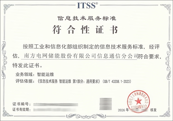 南網(wǎng)集團(tuán)首家!南網(wǎng)儲能信通公司斬獲ITSS智能運(yùn)維體系認(rèn)證,領(lǐng)跑儲能行業(yè)數(shù)字化運(yùn)維新賽道