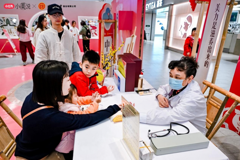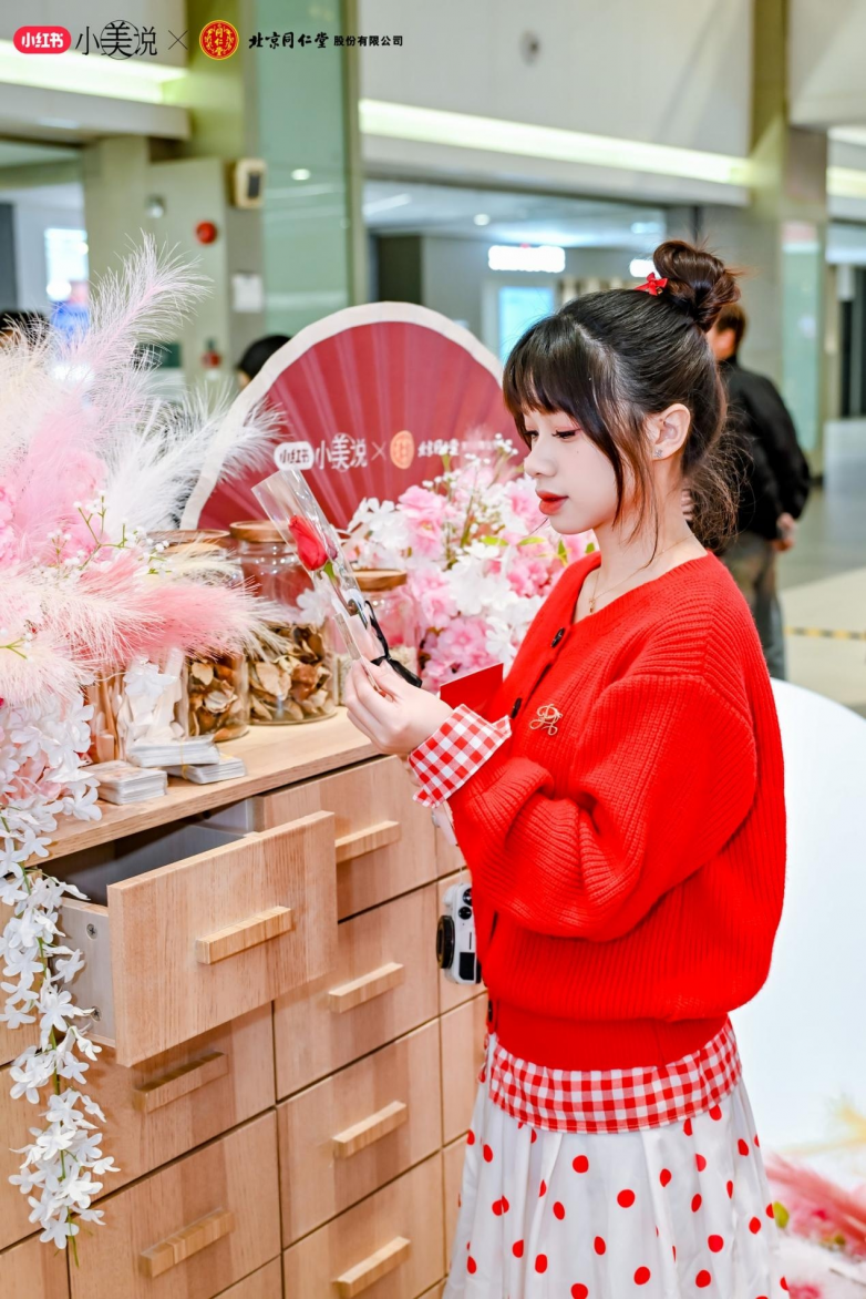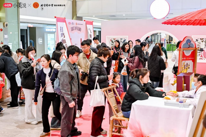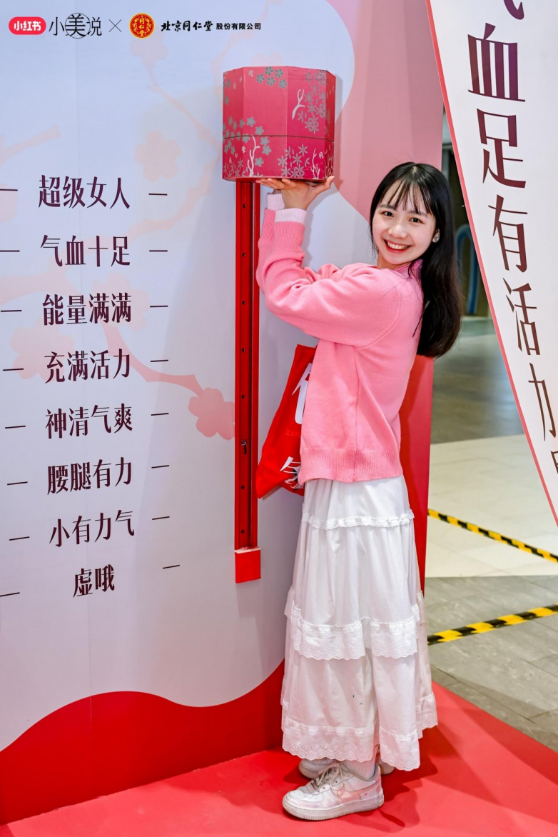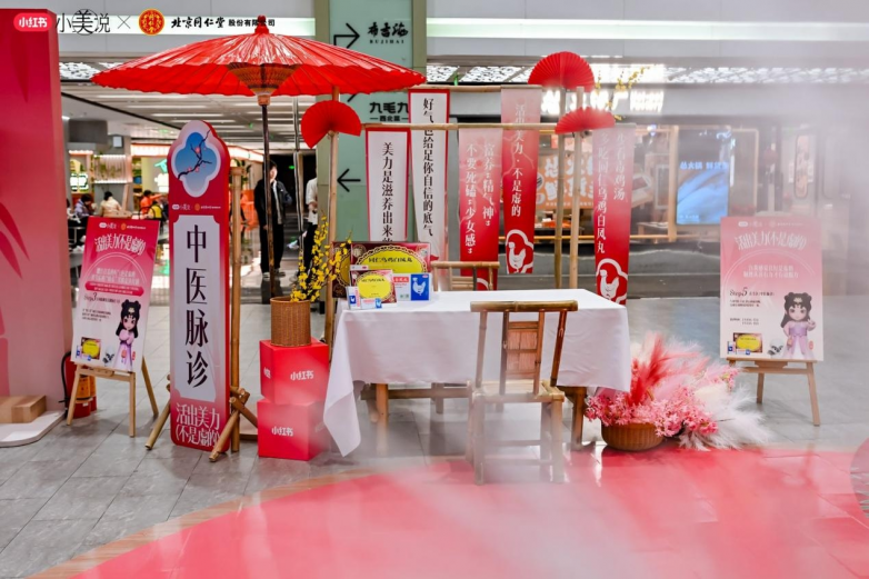 3月8日當天,北京同仁堂與小紅書「小美說」還共同推出了線下快閃活動;顒蝇F場花樹、卷軸、紅扇、拱門、古風打卡墻等布置將女神節活動氛圍拉滿;顒訁⑴c者通過入口處領取“處方箋”集章卡,在國風NPC的指引下,前往各個區域完成推舉向上、中藥花柜、情景劇場、古法健身操、中醫脈診等打卡游戲體驗,便可參與抽獎活動。當天活動線下人流量近14.7萬,活動參與人數超550人。