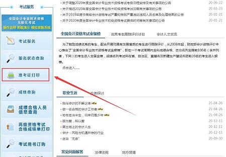 1、登錄財(cái)政部會(huì)計(jì)資格評(píng)價(jià)中心(選擇帶官網(wǎng)后綴的搜索項(xiàng)),在網(wǎng)站首頁(yè)左側(cè)找到“考生服務(wù)”-“準(zhǔn)考證打印”,點(diǎn)擊進(jìn)入;